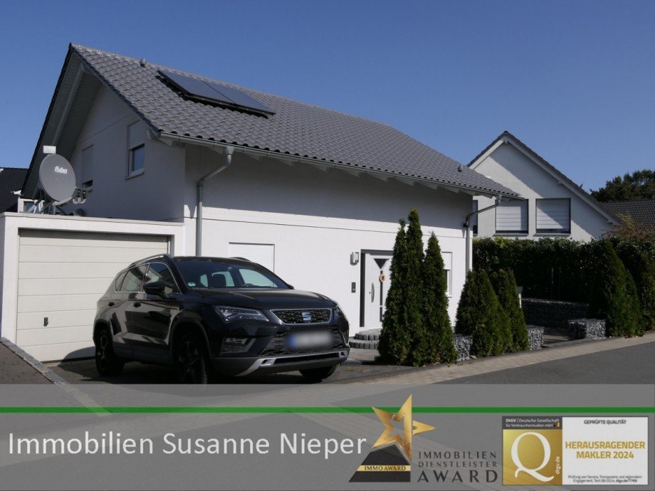 Dieses freistehende, innovative Einfamilienhaus wurde 2007 (Fertigstellung 2008) voll unterkellert auf einem 443 m² großen Grundstück errichtet. Das Haus ist räumlich und technisch klar strukturiert, es handelt sich um ein Schwörer-Wärme-Direkt-Haus (Fertighaus). Sowohl beim Bau des Hauses als auch im späteren Verlauf standen Technik und Energieeinsparung stets im Mittelpunkt. Die Beheizung erfolgt über eine Frischluft-Wärme-Gewinn-Technik mit Frischluftheizsystem und Erdrohrwärmetauscher mit Kleinwärmepumpe zum Heizen und Kühlen mit Auslassventilen mit PTC-Elementen, somit gibt es fast keine Heizkörper. Die Energieeffizienzklasse liegt bei A bei einem Energiekennwert von 34,24 kWh/(m²*a). Die Heizelemente in den Auslassventilen werden über Raumthermostate geregelt. Dieses System kann nicht nur zum Heizen, sondern im Sommer auch zur Kühlung der Raumluft genutzt werden. Die Thermosolaranlage mit 4,8 m² Kollektorfläche sorgt für die Warmwasserbereitung und verfügt über einen 290 Liter Warmwasserspeicher. Die Eingangstür ist mit einem Sicherheitspaket der Stufe 3 ausgestattet. Alle Fenster sind isolierverglast, abschließbar und an allen senkrechten Fenstern mit elektrischen Außenrollos ausgestattet. Die Kellerdecke ist wärmegedämmt. Das Haus verfügt über eine Hebeanlage sowie eine Vorbereitung für Photovoltaik. Zahlreiche TV- sowie Telefonanschlüsse sind vorhanden. Der Fernsehempfang erfolgt über eine SAT-Anlage. Die Garage ist ca. 16 m² groß und mit einem elektrischen Sektionaltor ausgestattet. Der gepflasterte Platz vor der Garage dient als zweiter Stellplatz. Das Grundstück ist nahezu rechteckig geschnitten mit klaren Linien in der Gestaltung und Bepflanzung. Das Grundstück hinter dem Haus ist mit einer Sichtschutzhecke bepflanzt und kaum einsehbar. Die umgebende Bebauung ist kleinteilig und besteht überwiegend aus Einfamilienhäusern.